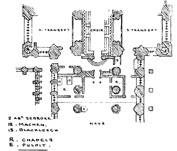 The whole of the Abbey buildings were surrounded by Abbot Peter with a stone wall, and the necessary gates—viz.7 the great gatehouse on the west, another on the south, and a third more to the east. All these can be identified from the small plan of the monastic buildings, reproduced (p. 103), by permission of Mr F. S. Waller. The Saxon Chronicle tells us that in 1122, while the monks were singing mass, fire burst out from the upper part of the steeple, and burnt the whole monastery. Some time between 1164 and 1179 one of the western towers, probably the south-west tower, fell down. Fire in 1190 is said to have destroyed the greater part of the city, as well as almost all the buildings in the outer court. Helias, the sacrist, also made new stalls for the monks in the choir. Of these Early English stalls, a fragment has been thoughtfully and carefully preserved behind the seat of the Canon in residence.