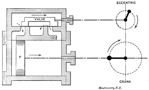 An enlarged section of the cylinder showing the action of the valve for admitting and exhausting the steam is shown in Fig. 2. In this case the piston is shown in its extreme backward position, ready for the forward stroke. The steam chest L is filled with steam at boiler pressure, which is being admitted to the narrow space back of the piston through the valve N, as indicated by the arrows. The exhaust port M is in communication with the other end of the cylinder and[5] allows the piston to move forward without resistance, except that due to the piston-rod, which transfers the work done by the expanding steam to the crank-pin. The valve N is operated automatically by a crank or eccentric attached to the main shaft, and opens and closes the supply and exhaust ports at the proper time to secure the results described.